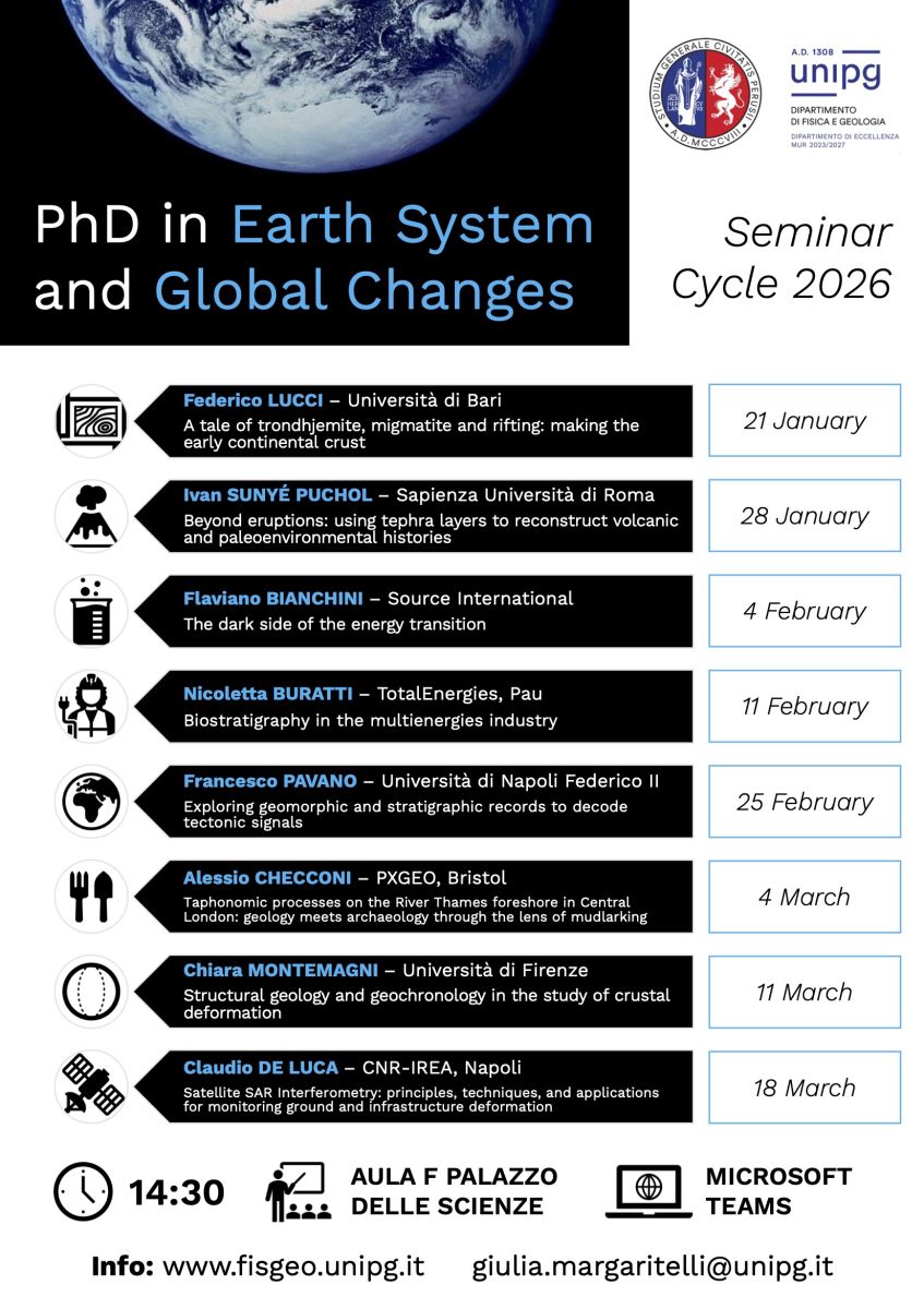 su indicazione del Prof. Marco Cherin (Università di Perugia), vi segnaliamo il Ciclo di Seminari 2026 del Dottorato in Sistema Terra e Cambiamenti Globali dell'Università degli Studi di Perugia, che avrà inizio il 21 gennaio 2026.