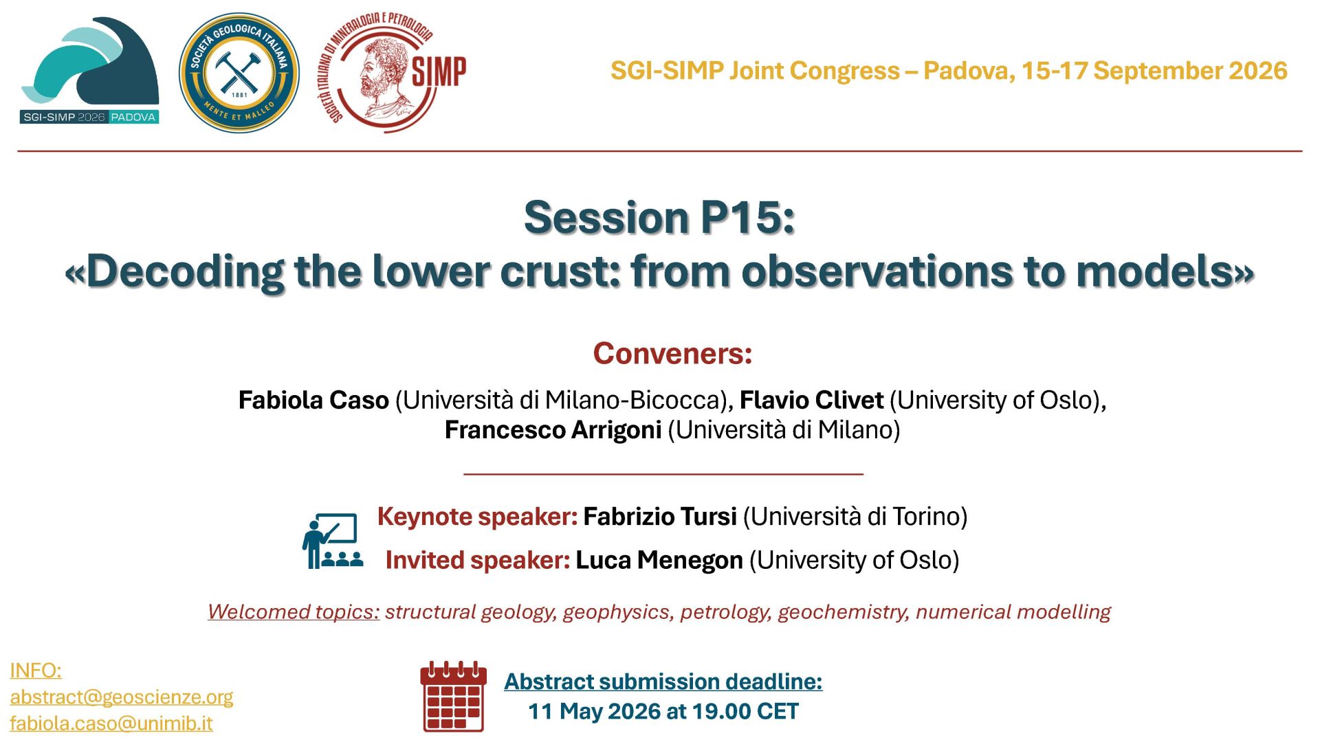 La sessione P.15 intitolata "Decoding the lower crust: from observations to models" mira ad investigare la crosta inferiore integrando diversi approcci tra cui osservazioni strutturali, geofisiche, geochimiche e petrologiche al fine di ricostruire modelli che spieghino l'evoluzione della crosta inferiore e la sua struttura in diversi contesti tettonici.